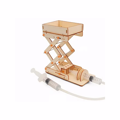 In the hydraulic lifting platform educational toy, the syringes are connected in a special way. When you push down on the plunger of one syringe, the water travels through the tubes and pushes the plunger of the other syringe up. This second syringe is connected to the platform, and as the plunger moves up, it pushes the platform higher. By pushing down on the syringe, you can make the platform go up and down!